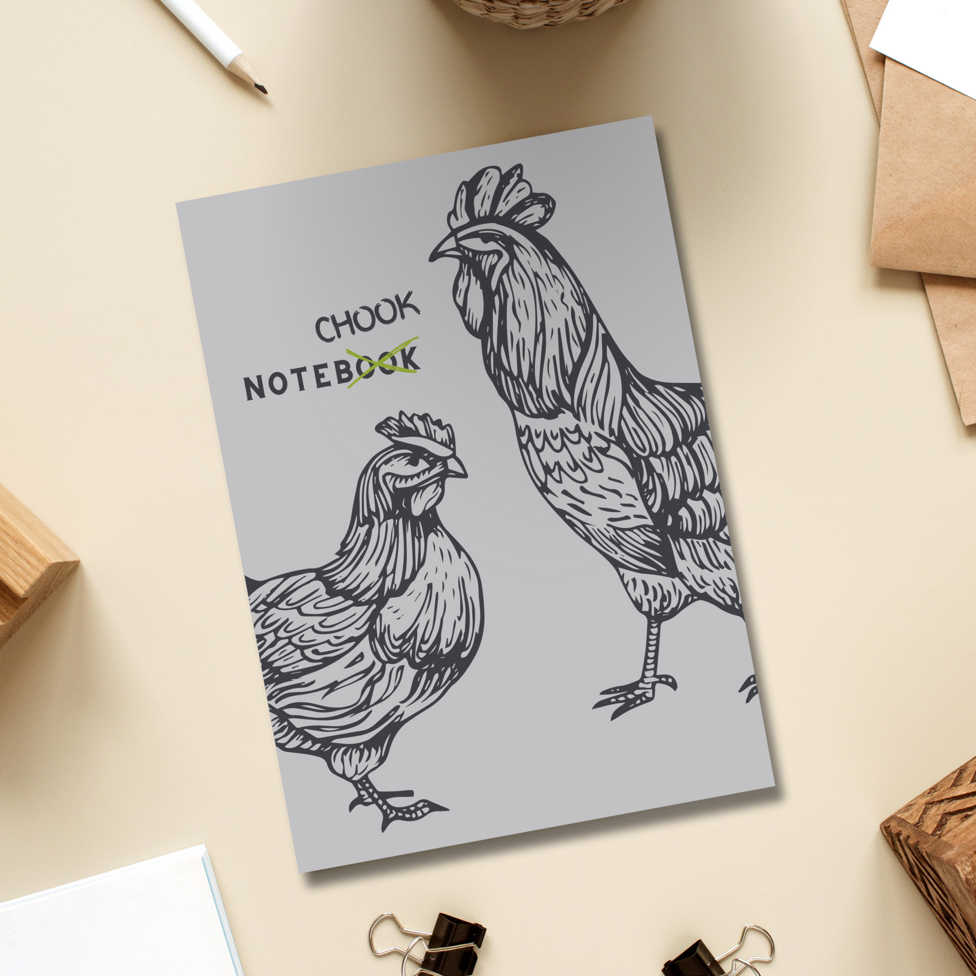 Inspired by our quirky rescued chickens or "chooks", this charming notebook is ideal for making a to-do list, planning your next adventure, or writing down your favourite plant-based recipes! It features a hen and cockerel illustration on a light grey background.
