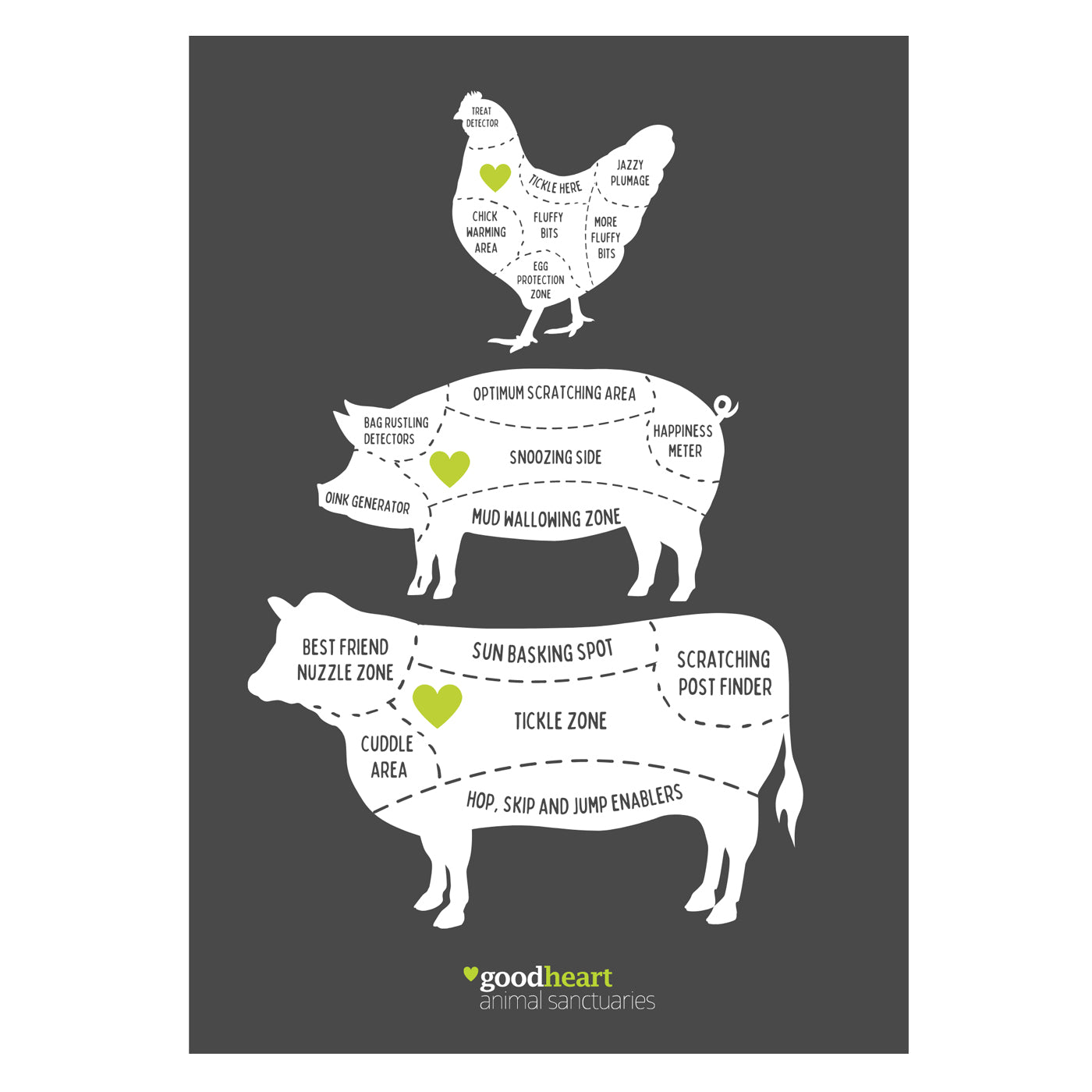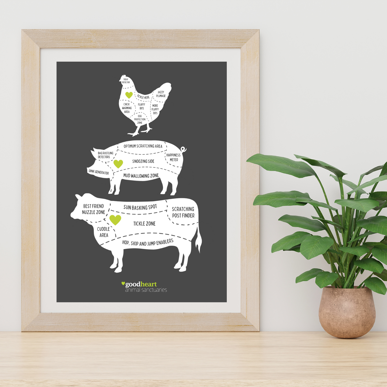 Celebrate your love for animals with this beautiful 'Cuts of Kindness' unframed print, exclusively created by the Goodheart team featuring a cow, pig and hen silhouette.
