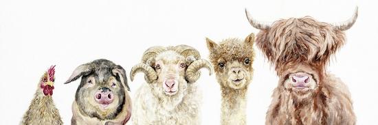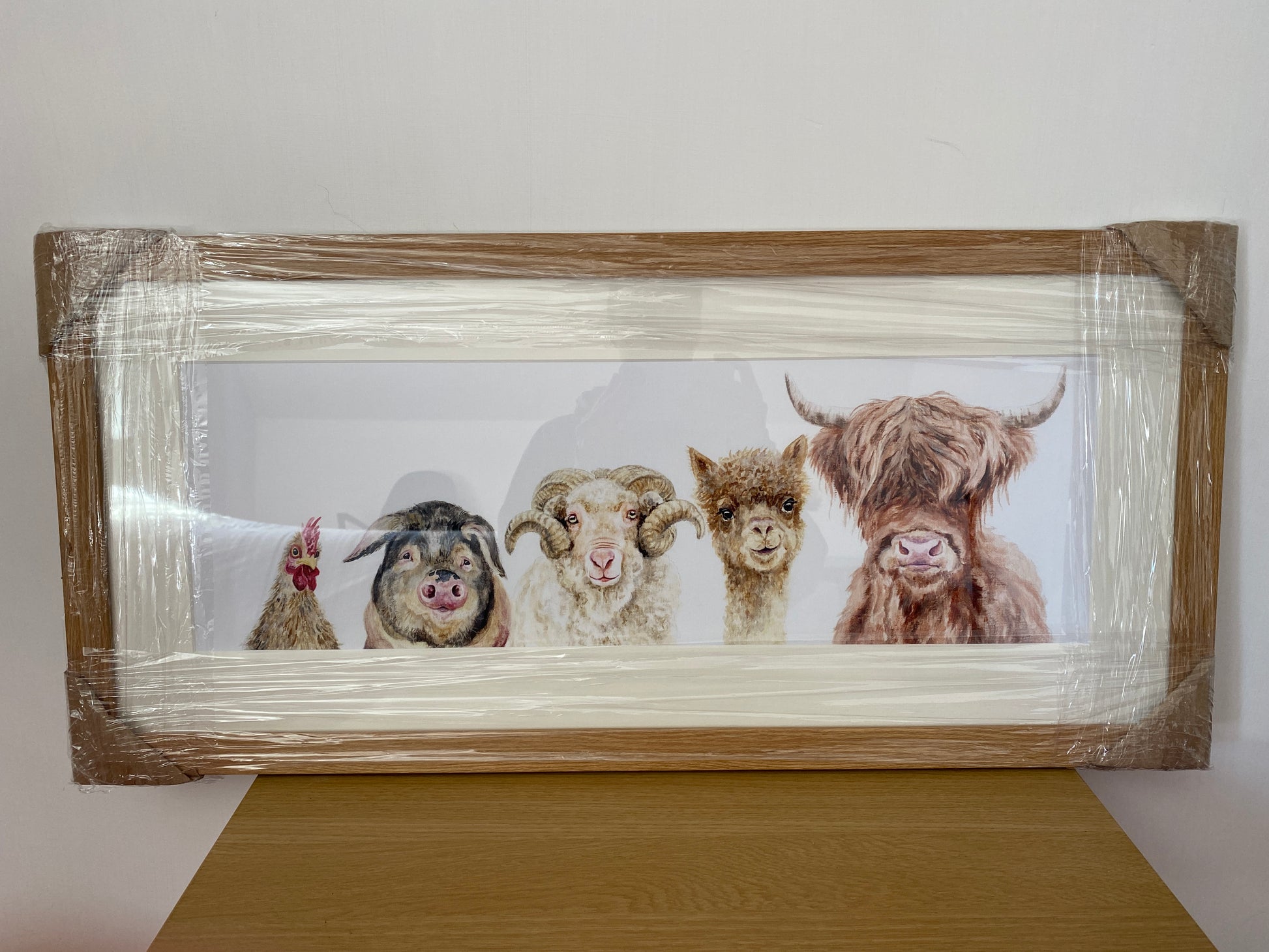 This charming framed print features a lovable line-up of farm animals, perfect for a living room or kitchen, or for brightening up children's bedrooms, nurseries, or playrooms. The lovely illustration showcases a highland cow, alpaca, sheep, pig, and chicken, adding warmth and whimsy to any space.