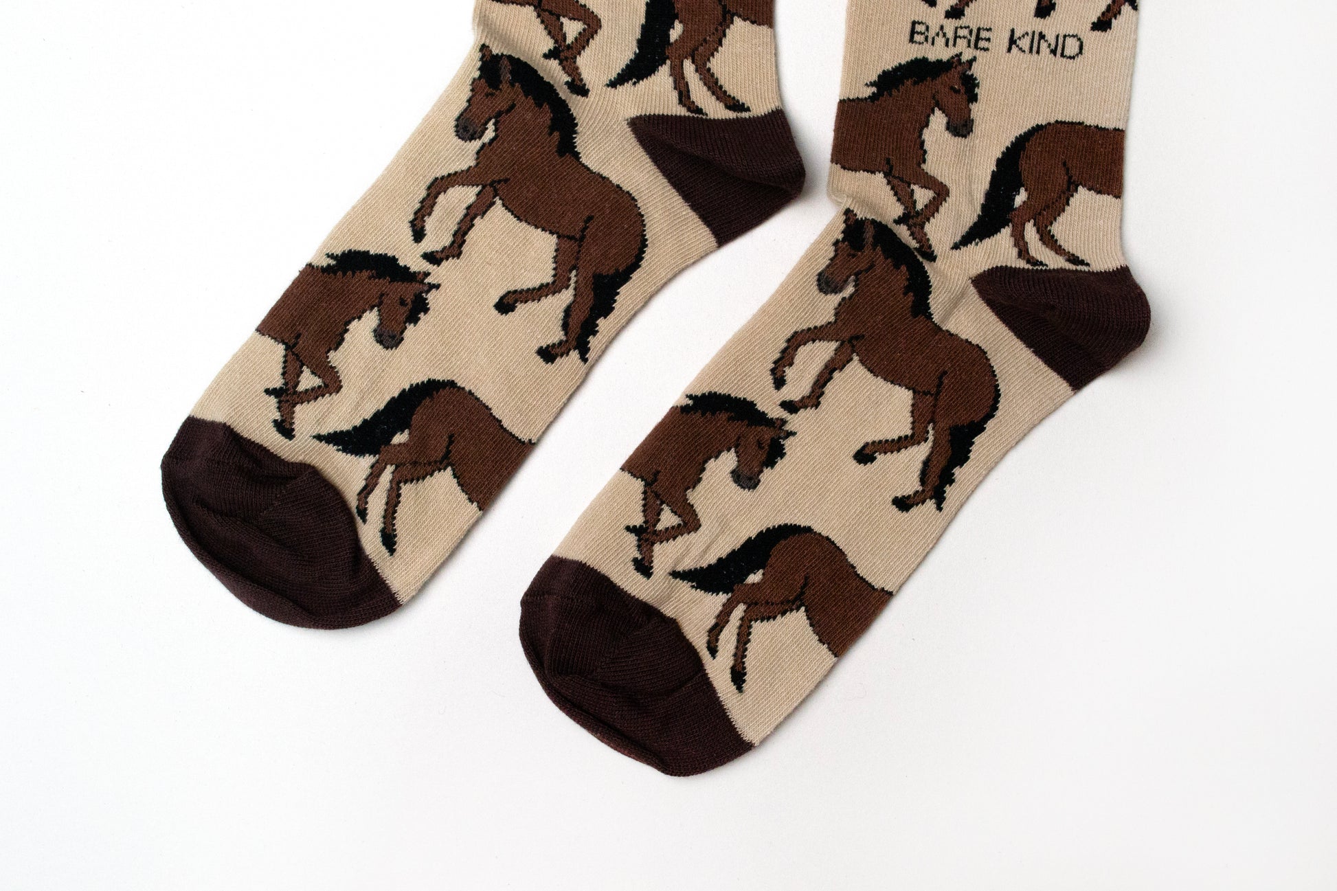 We love these horse socks from Bare Kind, and hope you will too! They feature elegant horses in a light brown background.