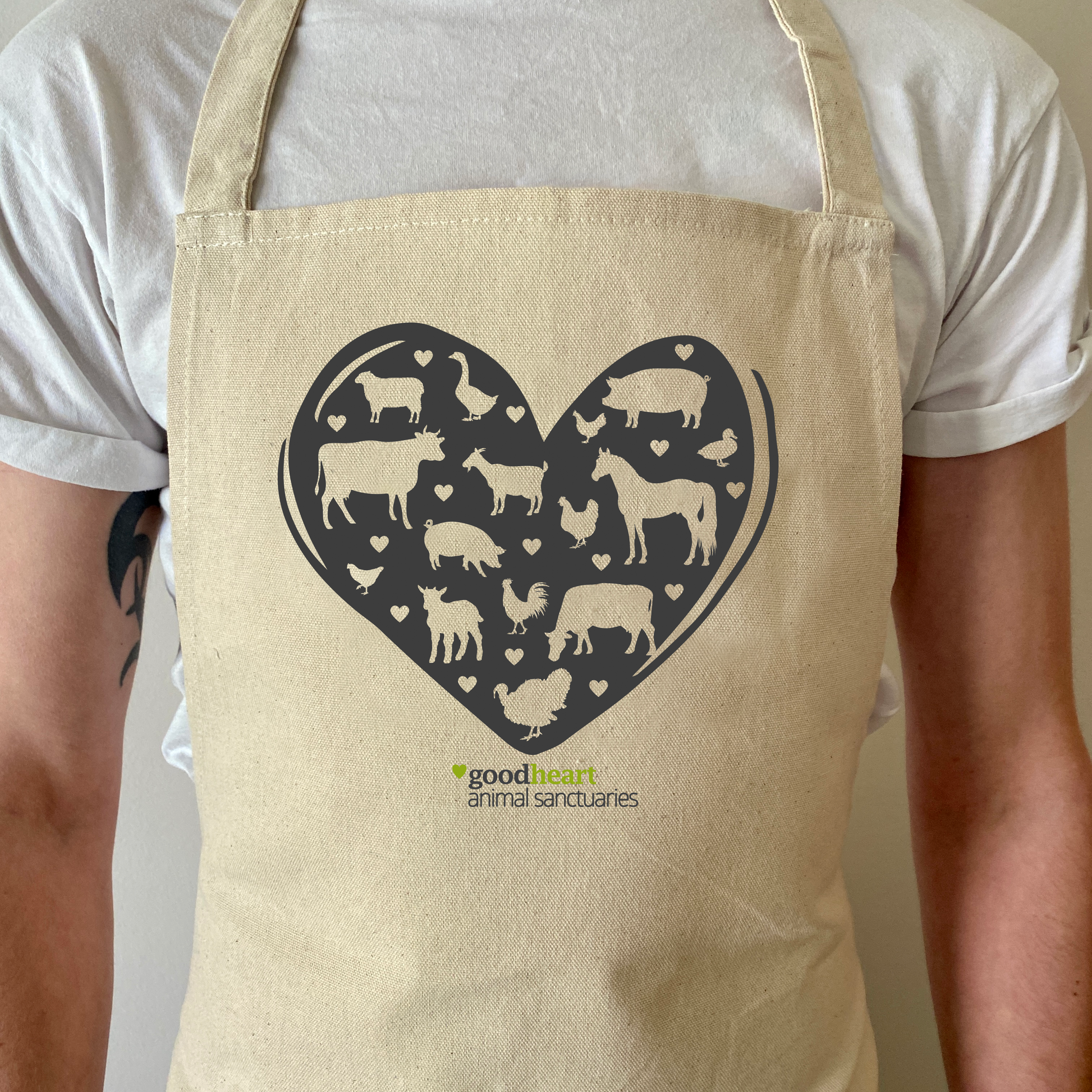It is with this sentiment in mind that we created the design for this contemporary apron, made from 100% certified organic cotton in a natural colourway. The design features an array of farmed animals in a large dark grey heart. The apron includes two adjacent pockets with tie-back closure.