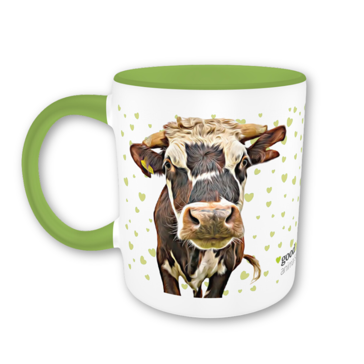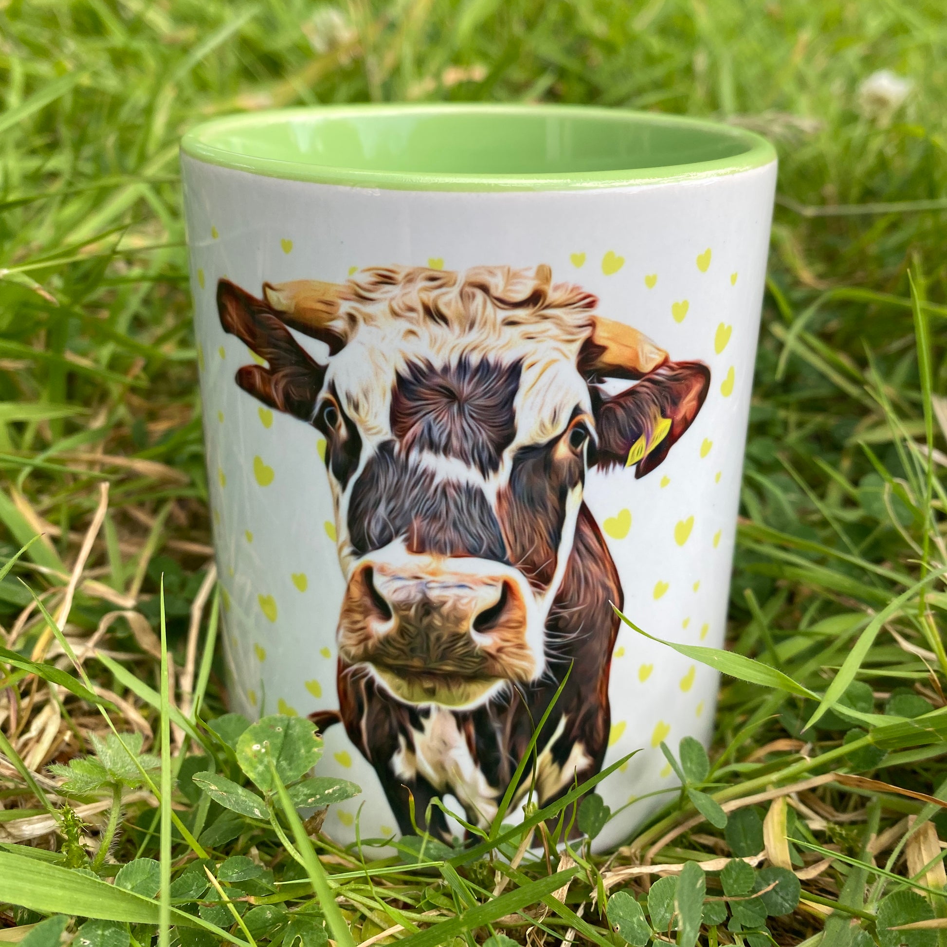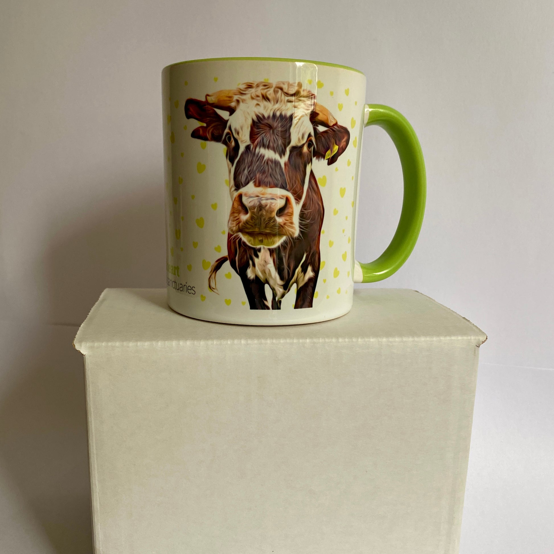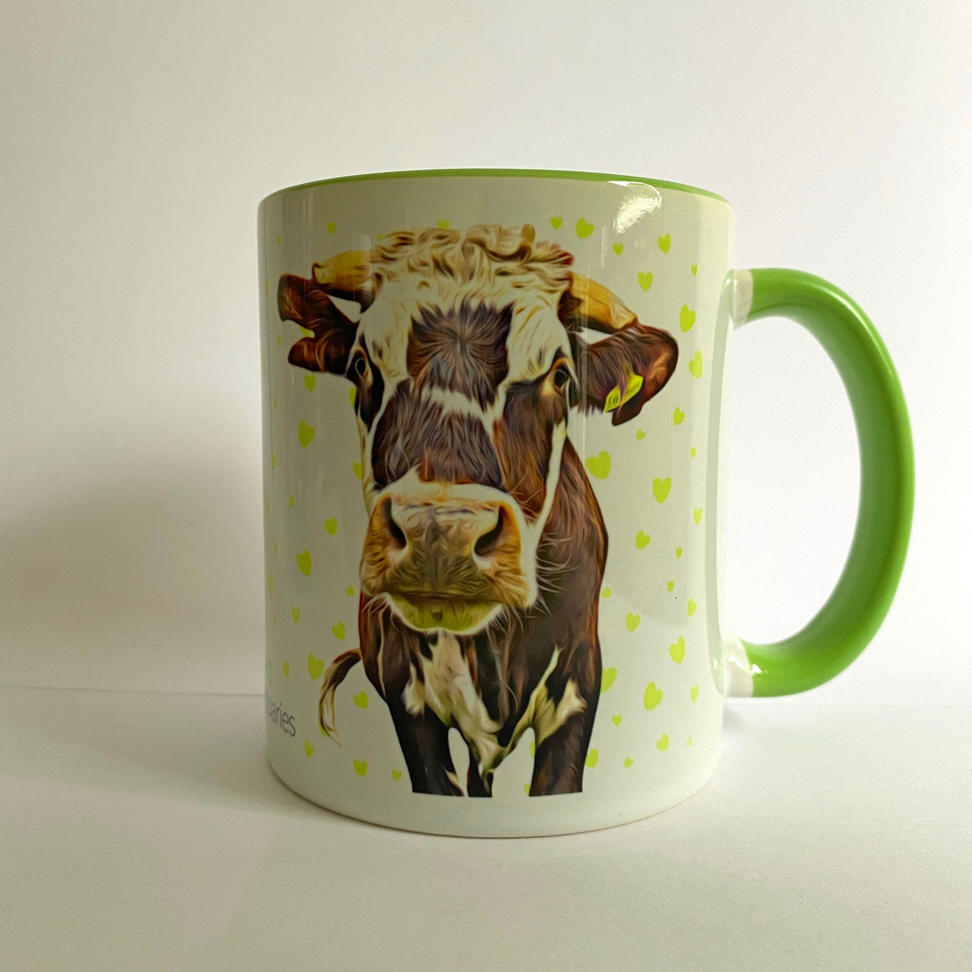This design features Rufus the cow on a backdrop of lime green hearts with our logo. The mug has a pale green-coloured inside and a matching green handle.