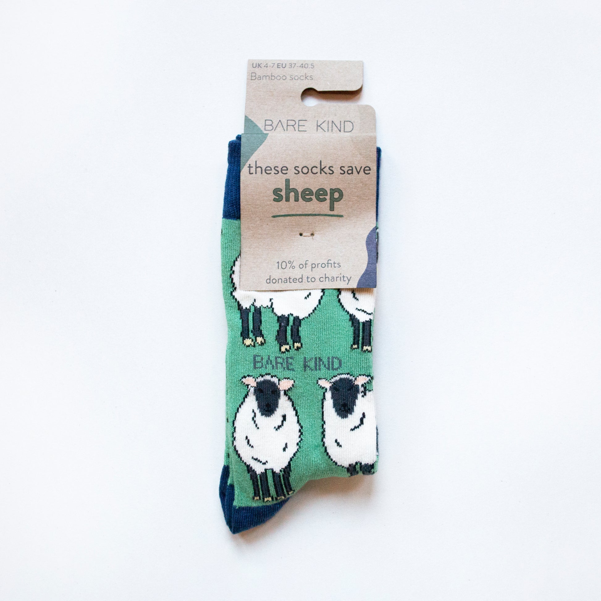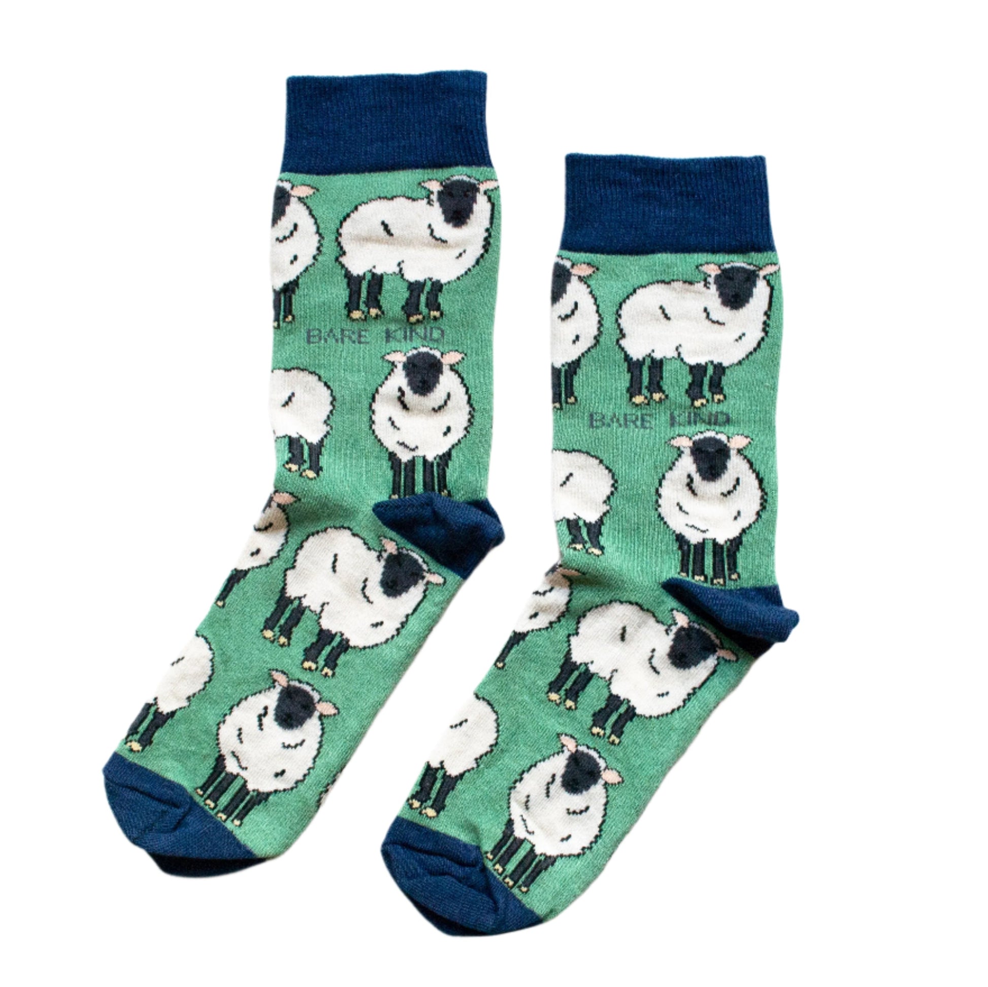 Wrap your feet in warmth and softness with these sheep socks from Bare Kind, featuring an adorable sheep design on a green background.