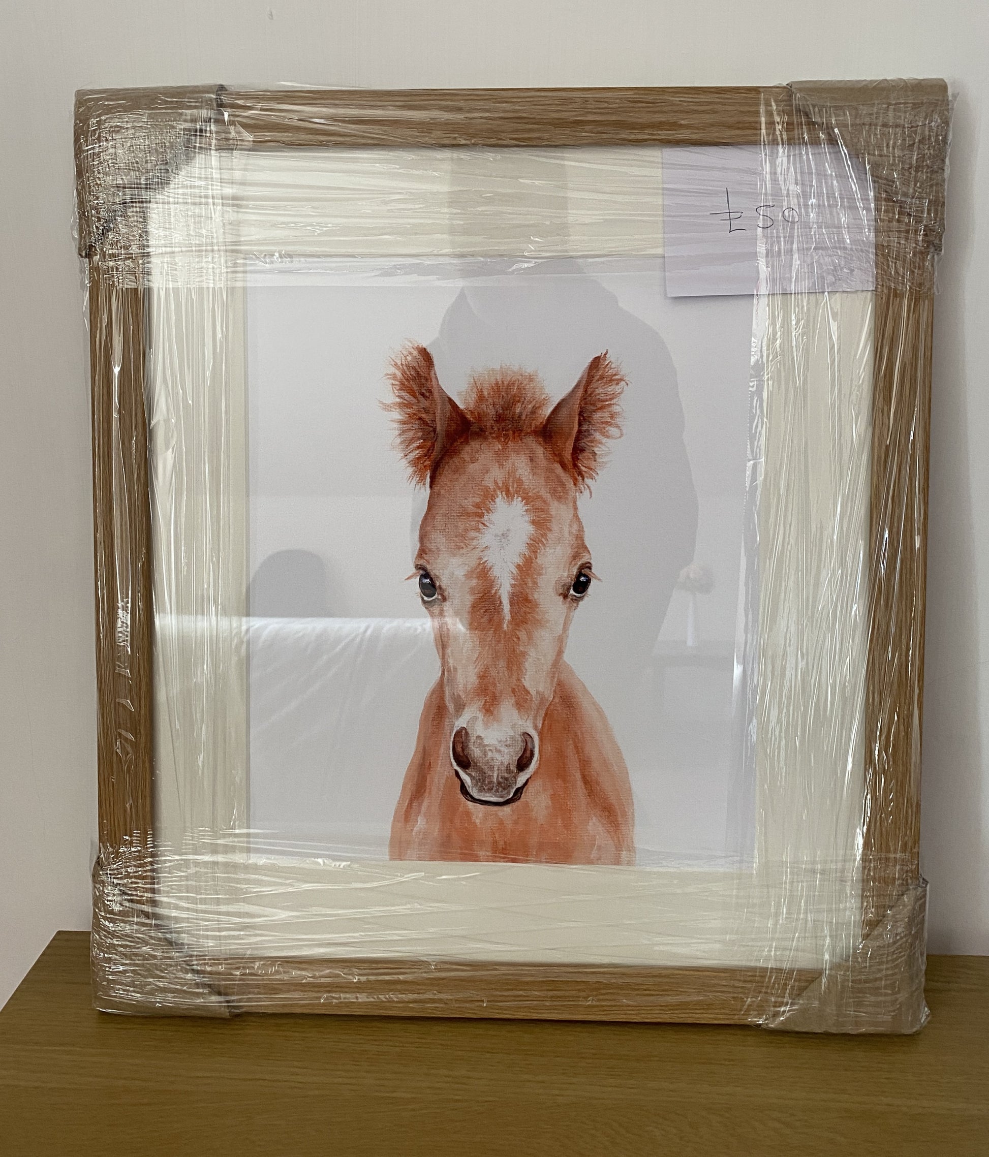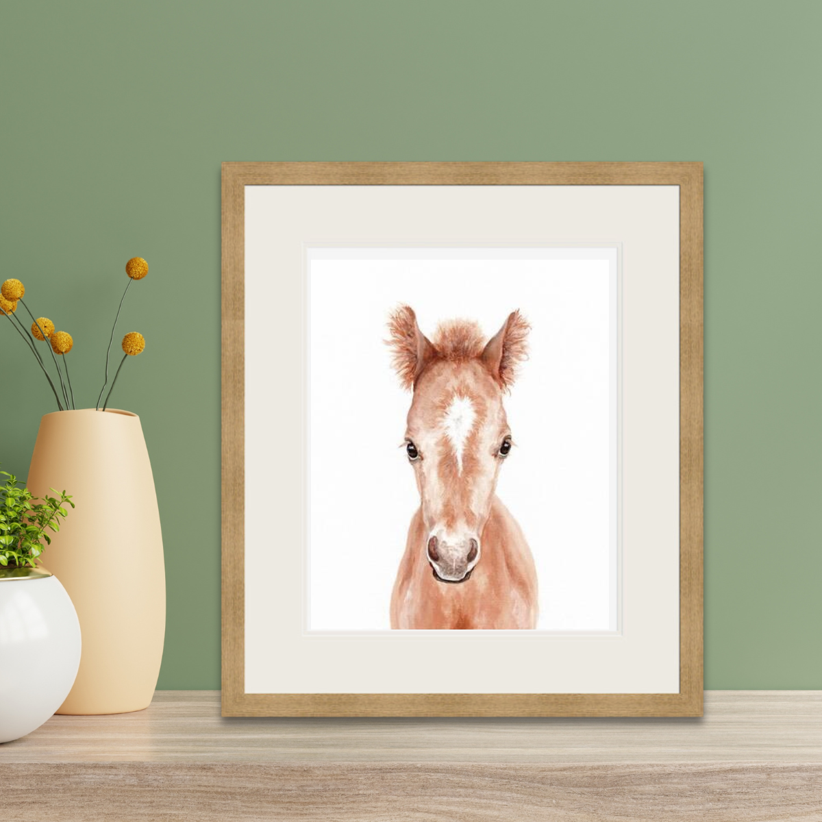 Introducing this enchanting giclée framed print featuring a sweet illustration of a foal, ideal for brightening up children's bedrooms, nurseries, or playrooms. This heart-warming artwork is beautifully presented in a natural wooden frame with a mount, adding a touch of fun and charm to any space.